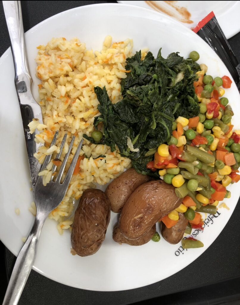 സൂപ്പർമാർക്കറ്റിൽ എത്തിയ ഞാൻ റെസ്റ്റോറന്റിന്റെ ഒരു മൂലയിലുള്ള ഇരിപ്പിടത്തിൽ ഭാണ്ഡം ഇറക്കിവെച്ച് ഫോൺ ചാർജിൽ ഇട്ടു. നേരെ ശുചിമുറിയിൽപോയി ഒന്ന് വൃത്തിയായി വന്നശേഷം കൗണ്ടറിൽപോയി വിഭവങ്ങൾ നോക്കി മനസ്സിലാക്കി. തക്കാളി ചോർ, ചുട്ടെടുത്ത ഉരുളകിഴങ്ങ്, ആവിയിൽ വേവിച്ച പയർ വർഗ്ഗങ്ങൾ, പിന്നെ ചീര ഉലത്തിയതും ഓർഡർ ചെയ്തു. ഓർഡർ ചെയ്യുന്നതിനുമുൻപായി ഓരോ വിഭവങ്ങളിലും അടങ്ങിയിട്ടുള്ള സാധനങ്ങൾ വായിച്ചുനോക്കിയിരുന്നു.