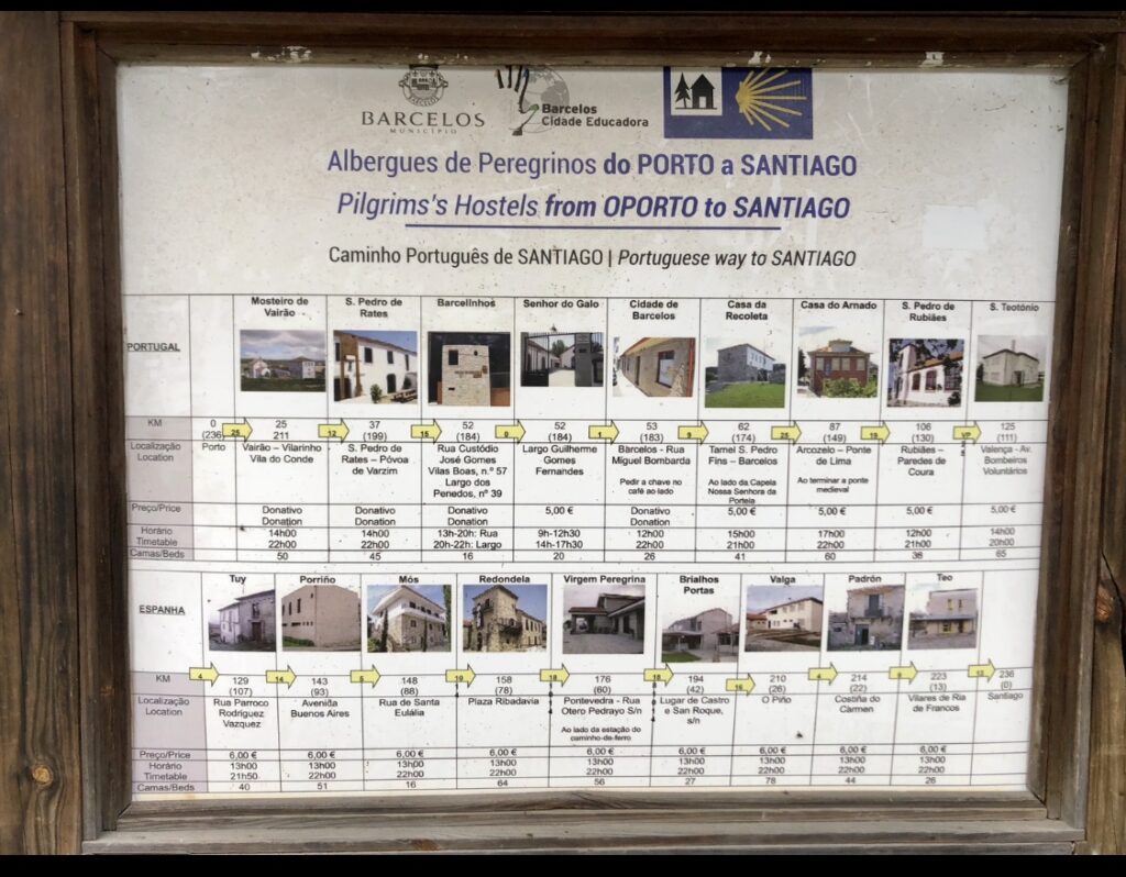 പോർത്തോ മുതൽ അങ്ങ് സാൻറ്റിയാഗോ വരെയുള്ള ആൽബർഗുകളുടെ വിവരങ്ങളാണ് ആ ഫലകത്തിൽ. മഴയുടെ മട്ടും ഭാവവും മനസ്സിലാക്കുമ്പോൾ ഇനിയങ്ങോട്ട് എല്ലാദിവസവും ആൽബർഗുകളിൽത്തന്നെ അഭയം തേടേണ്ടിവരും എന്ന് ഞാൻ ഊഹിച്ചു.