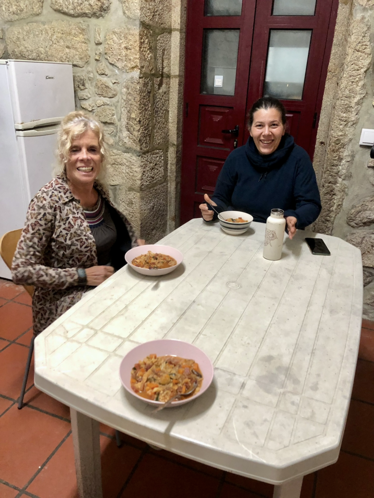 ഞാൻ അടുക്കളയിലേക്ക് എത്തിയതും അവിടെ എന്തോ അടുപ്പത്ത് പാകംചെയ്യാൻ വച്ചശേഷം സംസാരത്തിൽ മുഴുകിനിൽകുന്ന രണ്ട് സ്ത്രീകൾ എനിക്ക് സ്വാഗതം നേർന്നു. ഞാൻ അവരോടും പുഞ്ചിരിയോടെ നമസ്കാരം പറഞ്ഞു. അവർ രണ്ടുപേരും എന്നെ സ്വയം പരിചയപ്പെടുത്തിയശേഷം ഞാൻ എവിടെനിന്നും നടന്നുതുടങ്ങി, എത്രദിവസ്സമായി നടത്തം തുടരുന്നു മുതലായ കമീനോ വിശേഷങ്ങൾ തിരക്കി. ഞാൻ അതെല്ലാം അവർക്ക് വിവരിച്ചുനൽകി. രണ്ടുപേരിൽ ഒരു സ്ത്രീ ബ്രസീലിയൻ ശൈലിയിലുള്ള പോർത്തുഗീസും മറ്റെയാൾ യൂറോപ്പ്യൻ പോർത്തുഗീസുമാണ് സംസാരിക്കുന്നത്. ഇരുവരും യോഗയും, ആത്മീയ യാത്രകളുമൊക്കെയായി റിട്ടയർമെൻറ് ജീവിതത്തിലാണ് ഇപ്പോൾ. അവർ കാമീനോ നടക്കാൻ ഇറങ്ങിയതല്ല, മറിച്ച് ഞാൻ സന്ധ്യയിൽ പിന്നിട്ട ആ വലിയ പാർക്കിൽ ഇ സ്ത്രീകൾ അംഗമായ ഒരു കൂടായ്മയുടെ പരിപാടി ഉണ്ടായിരുന്നു. അതിനുശേഷം രാത്രിയിൽ തിരികെ പോർത്തോ വരെ വാഹനം ഓടിച്ചു പോകാനുള്ള പ്രായോഗിക ബുദ്ധിമുട്ടുകാരണം അവർ ഇവിടുത്തെ ആൽബർഗ് നടത്തിപ്പുകാരിയുമായി സംസാരിച്ച് ഒരു രാത്രിക്കായുള്ള അനുമതി നേടിയെടുത്തിരിക്കുകയാണ്.