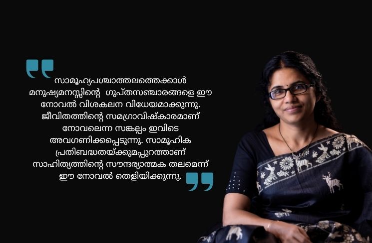 “എഴുന്നേൽക്കുമെന്ന് ഉറപ്പില്ലാതെ കിടക്കുമ്പോഴാണ് സമയം സൂക്ഷ്മമായി അറിയുന്നത്”ഇത്തരത്തിൽ കഥാപാത്രങ്ങളുടെ തൽസമയ നിരീക്ഷണവും സ്മരണയും നോവലിൽ ഇടകലർന്നുകിടക്കുന്നു. ആളുകളുടെ മനോഗതങ്ങളിലൂടെ ഭൂതകാലസംഭവങ്ങളിലേക്ക് വെളിച്ചം വീശുന്നു . പാതിമങ്ങിയ വെളിച്ചത്തിൽ താളത്തിന്റെ ഒരു മന്ദ്ര സ്ഥായിയിലല്ലാതെ ഈ നോവൽ വായിച്ചുപോകാനാവില്ല .